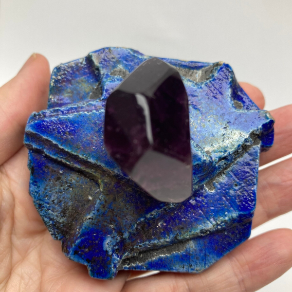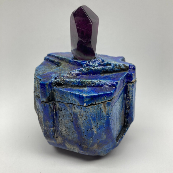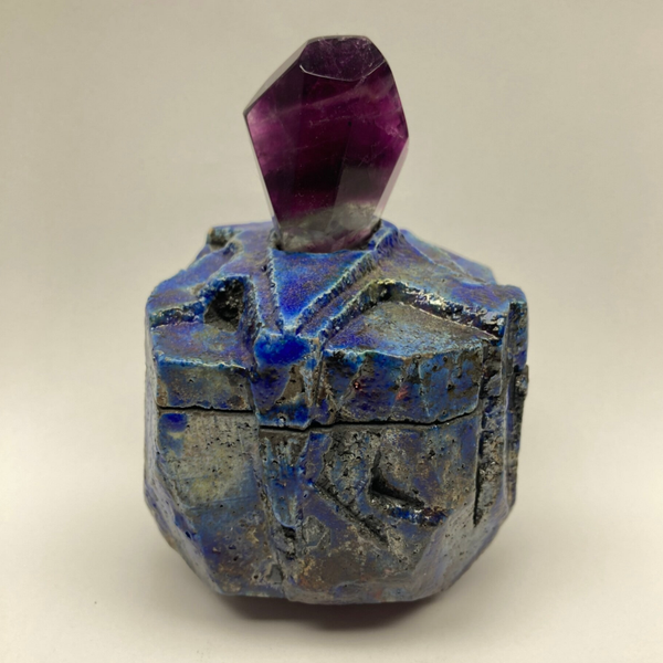 Bovenop de box zit een paarse Fluoriet, zie onderstaand voor een beschrijving van dit kristal
